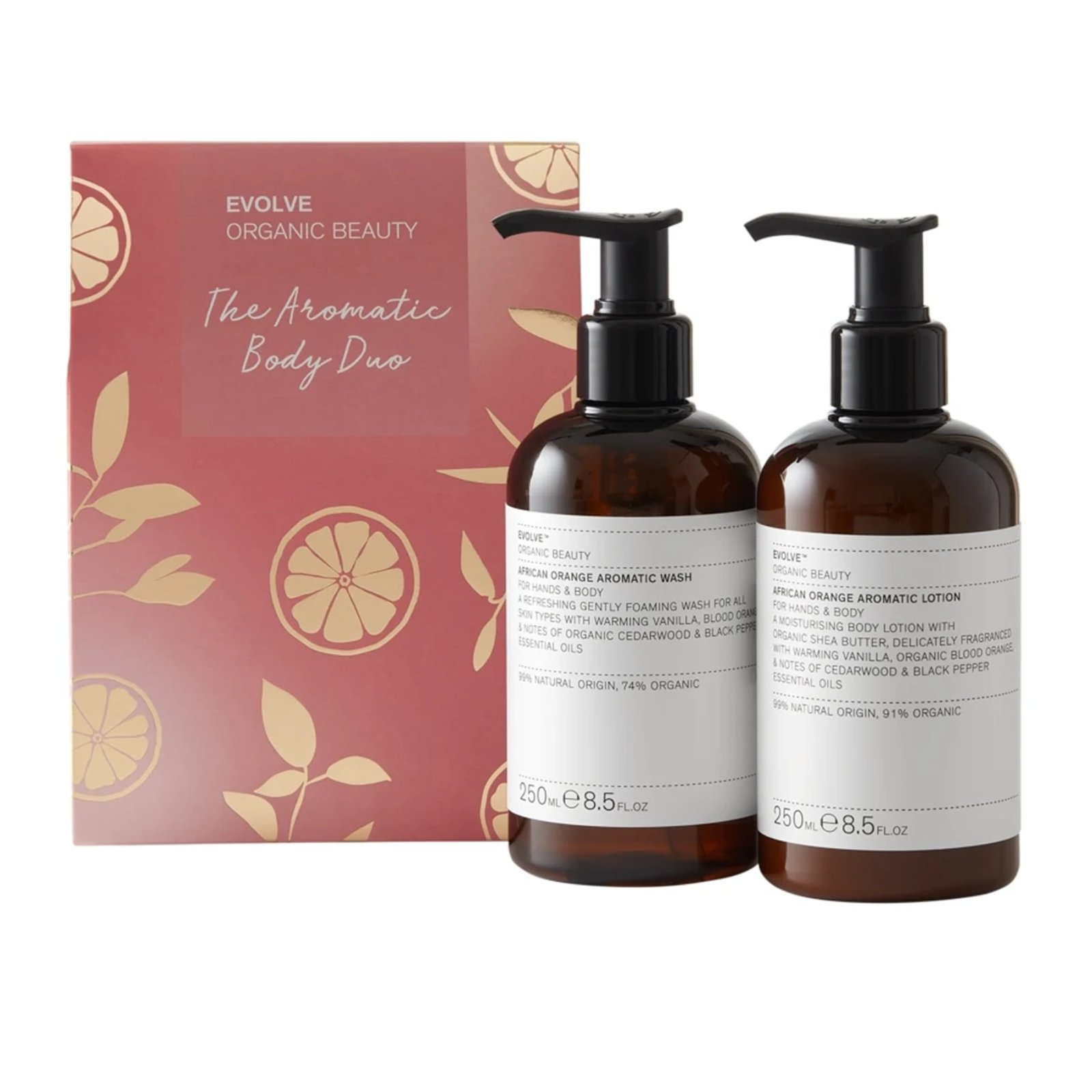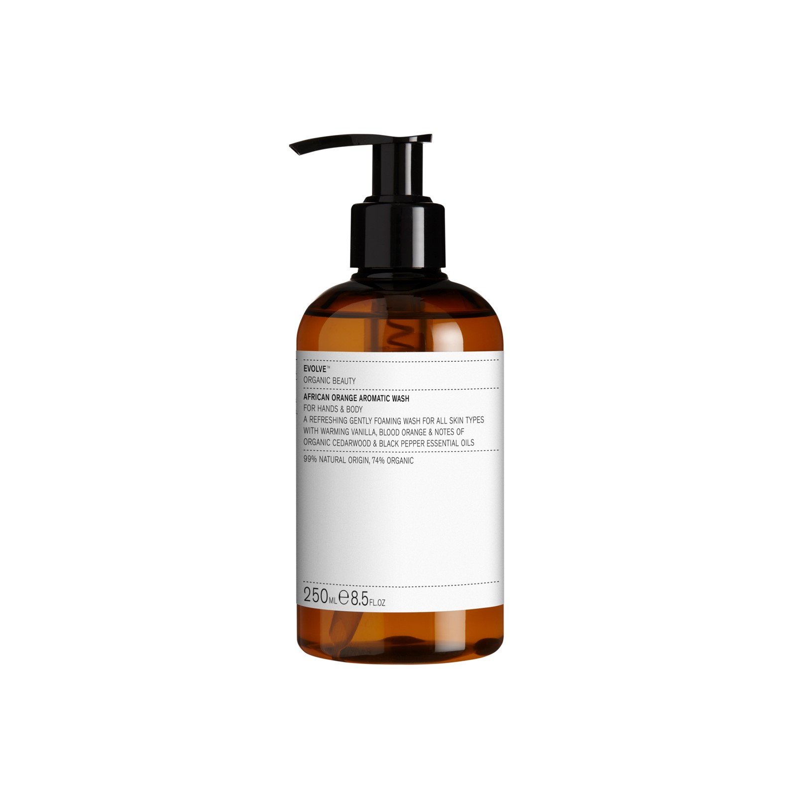 Suave limpieza con fragancia especiada para el viaje! El African Orange Aromatic Wash de Evolve Organic Beauty es un lujoso gel de lavado para manos y cuerpo. El gel calma la piel al lavarse con Aloe Vera y proporciona una piel suave y sedosa. Los aceites esenciales de naranja sanguina, madera de cedro y pimienta negra no solo ofrecen una fragancia cálida y especiada, sino que la naranja sanguina estimula la producción de colágeno y la circulación de la piel, y la pimienta negra es un potente antioxidante con efecto antibacteriano. Esto resulta en un cuidado maravillosamente fragante y suave que deja tu piel suave y sedosa.