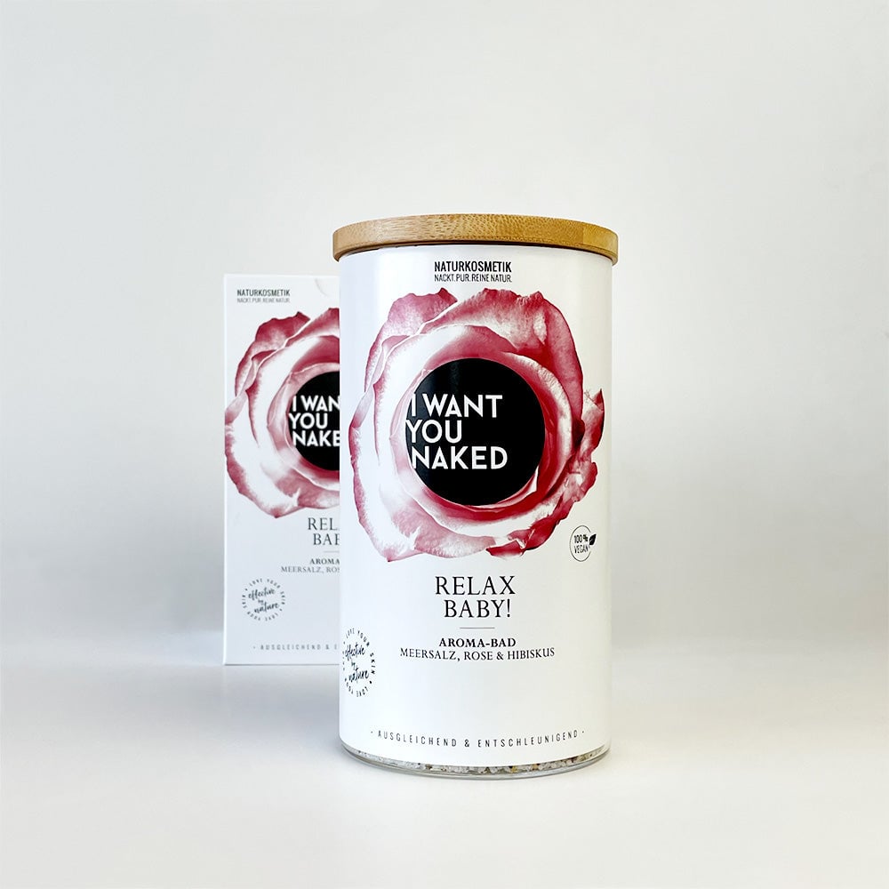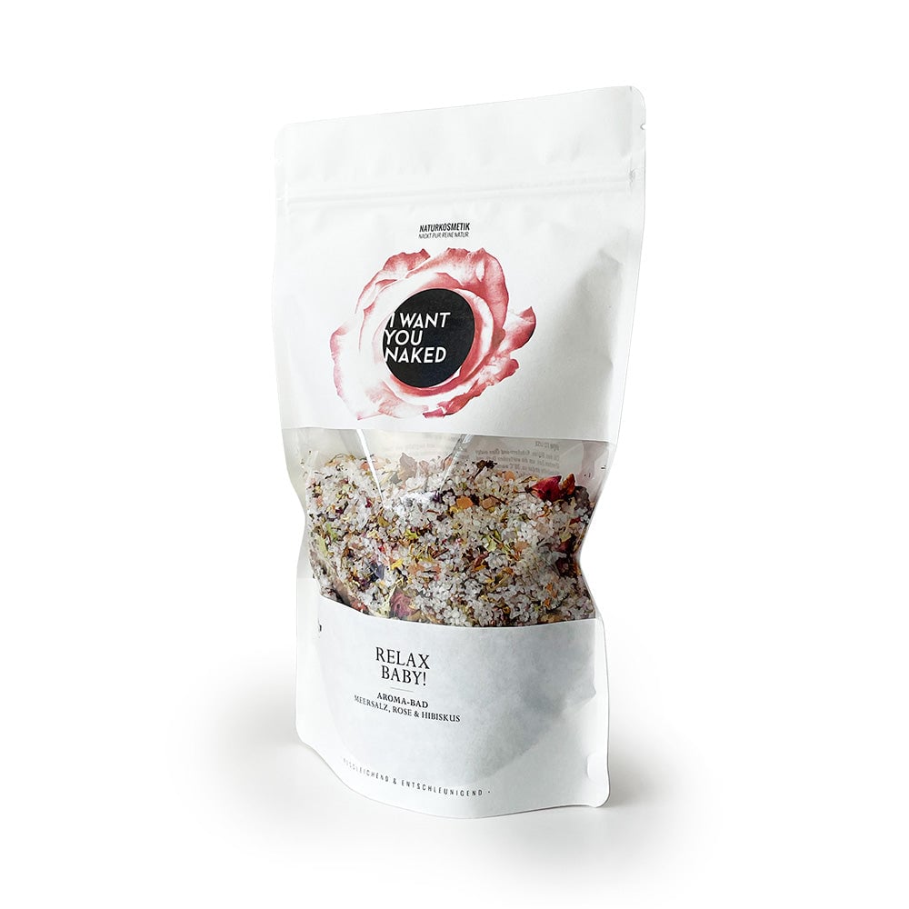 El equilibrante "RELAX BABY" Baño de aroma con sal marina, rosa & hibisco de I want you naked proporciona relajación y armonía para el cuerpo, la mente y el alma gracias a las poderosas plantas curativas. La rosa y la hierba de San Juan tienen un efecto equilibrante agradable. La sal de Epsom contenida regula la protección natural de tu piel y le proporciona suficiente hidratación. Tu piel se volverá suave y flexible. Baño de aroma con sal marina, rosa & hibisco es 100% natural, sin fragancias, colorantes ni conservantes sintéticos, silicona, parafina o materias primas a base de petróleo.