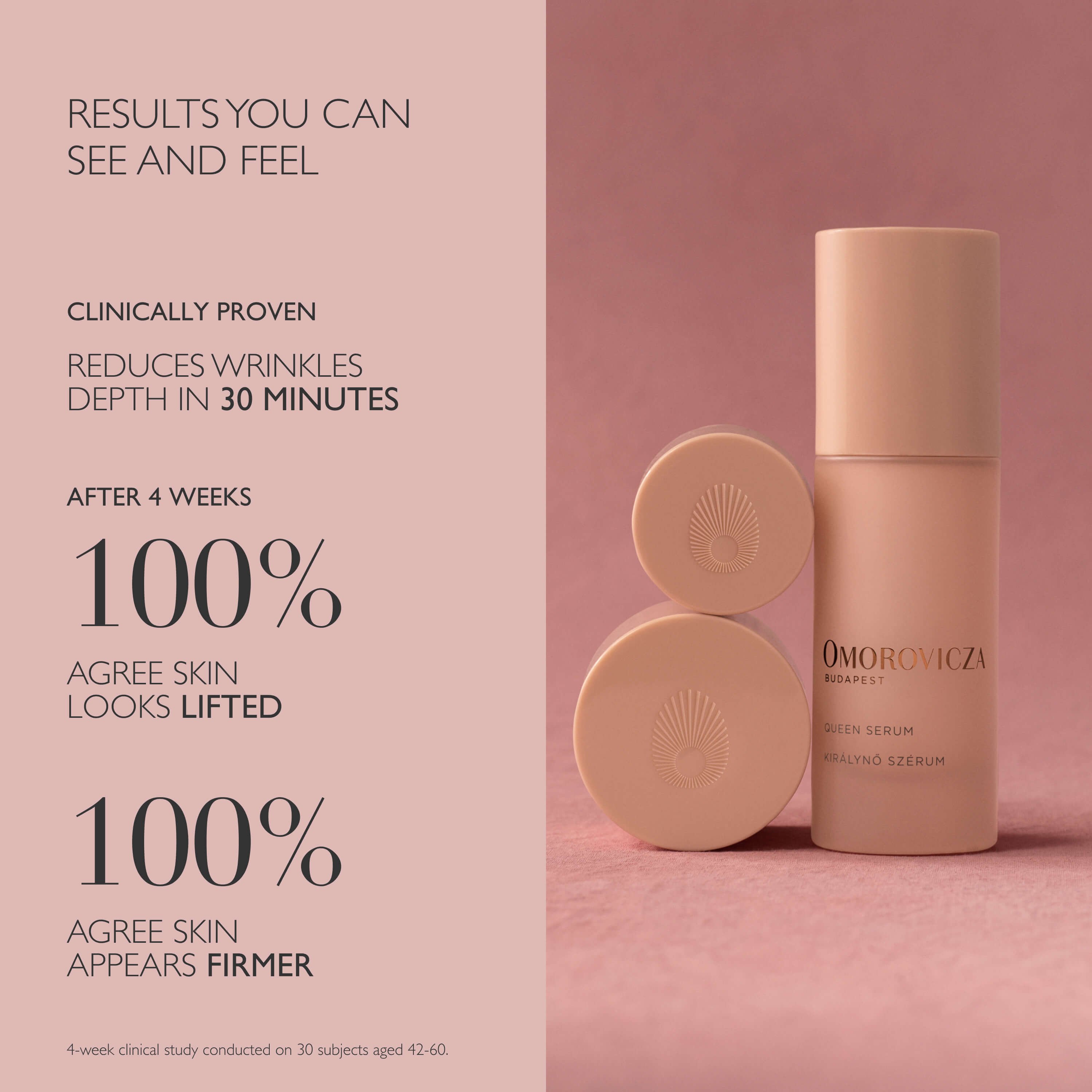 Das Queen Serum ist der Retinol Partner für den Tag und zaubert einen straffen und jugendlich frischen Teint. Klinische Studien haben bestätigt, daß Falten und Fältchen bereits 30 Minuten nach der Verwendung verringert werden. Es ist reich an mediterranen Mikro-Algen und Stammzellen der Lithops (Lebende Steine, eine Succulenten Art), die eine sanfte, pflanzliche Retinol Alternative mit dessen positiven Eigenschaften bieten, ohne die möglichen Nebenwirkungen aufzuweisen. Zusätzlich regeneriert das Queen Serum die Haut und schützt vor Verzuckerung der Hautzellen (Alterungsprozess). Angereichert mit dem patentierten Omorovicza Healing Concentrate™ mit den besonderen Budapester Mineralien, spendet das Serum der Haut Feuchtigkeit und strafft sie. Noten von Rose, Jasmin, Vanille, Zitrone und Birne sorgen für einen betörenden Duft. Vegan, für jeden Hauttyp geeignet, auch für sensible Haut und in der Menopause.