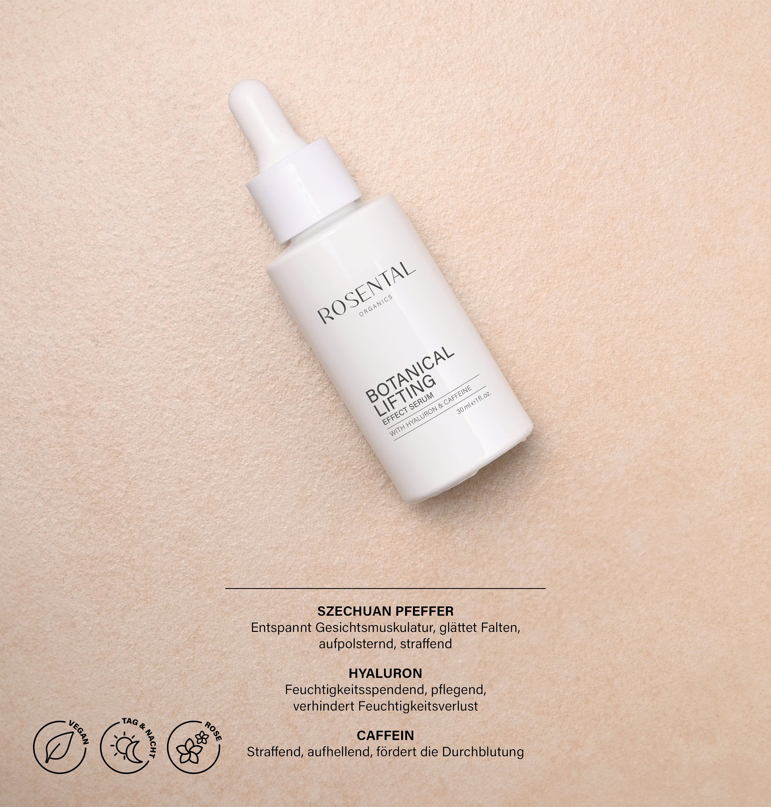 El suero de Botox natural con un nuevo nombre - ¡con el mismo contenido! Menos arrugas - sin inyección: Efecto Botox natural para una piel firme. La pimienta de Szechuan relaja los músculos faciales, de modo que la piel forma menos arrugas, las arrugas de preocupación, las patas de gallo y las líneas finas se alisan visiblemente a corto plazo. A largo plazo, el ácido hialurónico rellena las líneas finas, hidrata y nutre intensamente. La cafeína tiene un efecto tensor, iluminador y favorece la circulación. El suero estimula la producción de colágeno natural de la piel y acelera la regeneración celular - por lo tanto, también combate el envejecimiento por luz. Para una piel más fresca y firme. Con un delicado aroma a rosa. Adecuado para todo tipo de piel y para mujeres embarazadas. Vegano