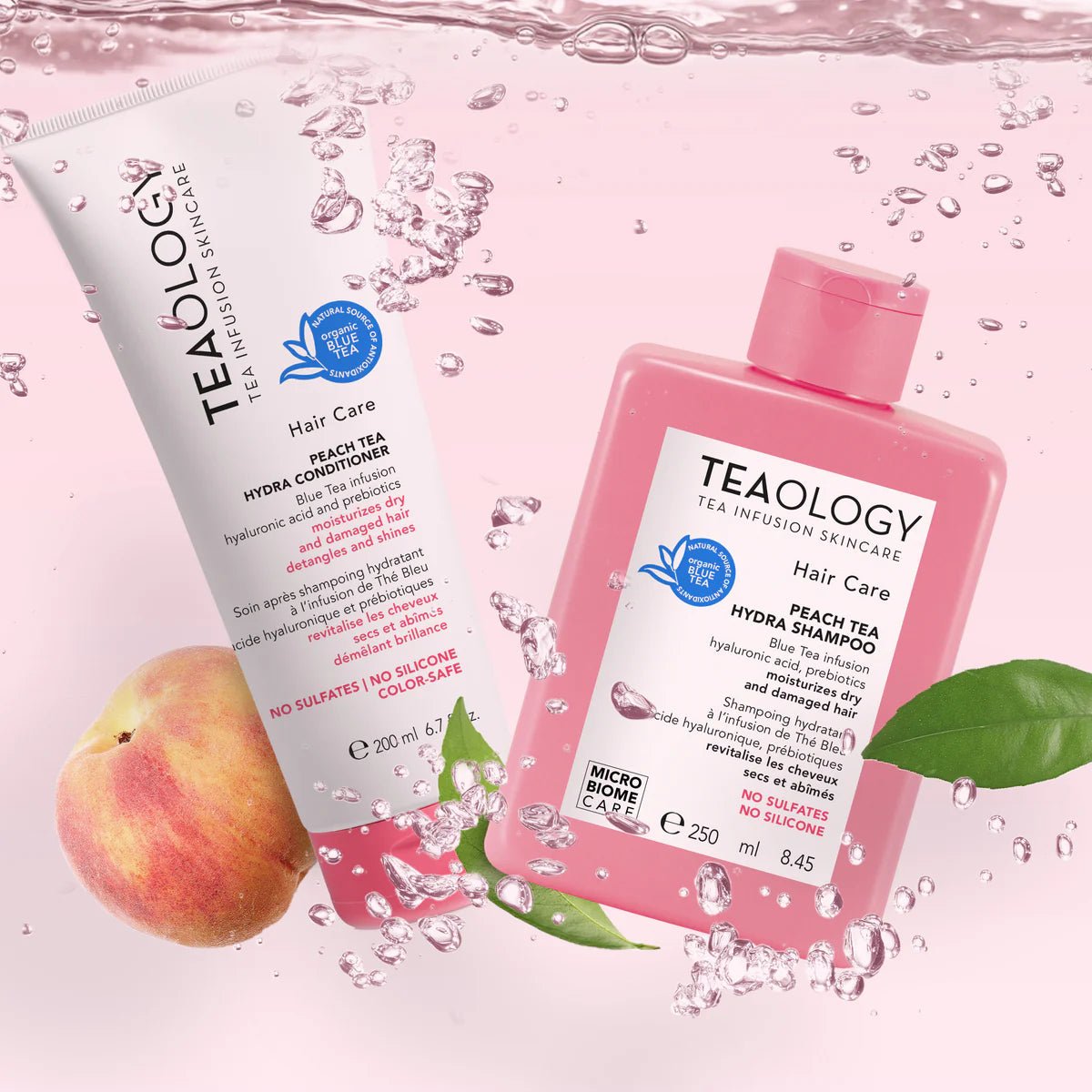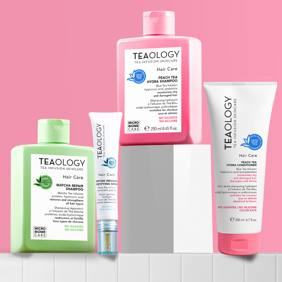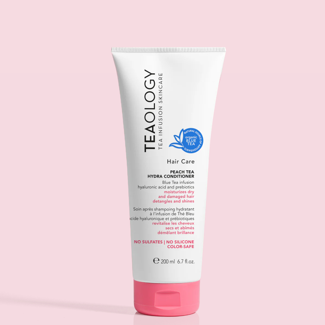 El acondicionador Hydra de té de durazno de TEAOLOGY. La formulación avanzada, libre de sulfatos y siliconas, contiene una infusión de té azul en lugar de agua, ácido hialurónico y probióticos, y cuida el cabello tratado con color de manera segura y sin decolorarlo. El potente acondicionador en crema suaviza, desenreda, fortalece y revitaliza gracias al ácido hialurónico de nueva generación, diseñado para mantener el cabello bien hidratado incluso después del aclarado. Antioxidantes e infusión de té clínicamente probada protegen contra la contaminación y la sequedad, hidratan y preservan la vivacidad de los rizos. El aceite de semilla de camelia nutritivo mejora el brillo y combate la rotura del cabello con el apoyo de un complejo probiótico que además fortalece el cuero cabelludo y aumenta la vitalidad del cabello. El extracto de durazno italiano proporciona una fragancia fresca y libre de alérgenos, y deja el cabello sedoso y más fácil de peinar. Apto para todo tipo de cabello. 97% de ingredientes naturales. Vega. Biodegradable. Dermatológicamente y probado en níquel.