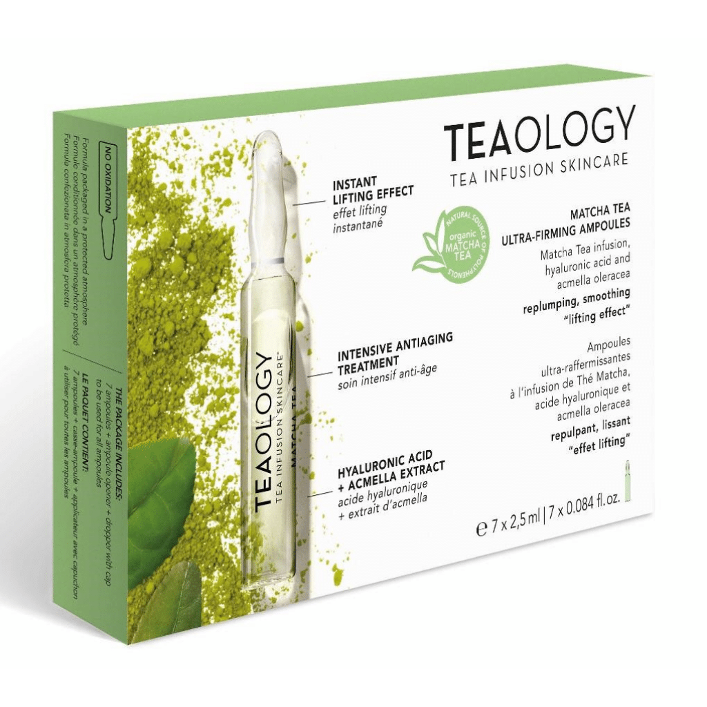 Las ampollas ultra reafirmantes de té matcha de TEAOLOGY proporcionan a su piel un efecto lifting inmediato, rellenan, alisan y ofrecen una intensa experiencia antienvejecimiento. Cada ampolla de vidrio contiene un concentrado con el poder antioxidante del té matcha, la acción hidratante y rellenadora del ácido hialurónico molecular y el efecto lifting inmediato del extracto de acmella oleracea (Paracress). Esta formulación con resultados notables y visibles de inmediato ha sido diseñada para unificar y aclarar el tono de la piel, alisar líneas finas y arrugas, y eliminar signos de estrés y fatiga. Cada ampolla contiene la dosis perfecta de: infusión de matcha orgánico, rica en antioxidantes y minerales que combaten los procesos de envejecimiento en las células y protegen la piel del estrés ambiental. Ácidos hialurónicos para mantener el contenido de humedad en las diferentes capas de la epidermis y la barrera hidrolipídica de la piel. Acmella oleracea (Paracress), una planta única que alisa la piel de inmediato y produce un efecto lifting natural. Después de la primera aplicación, las arrugas y los signos de envejecimiento de la piel ya se reducen visiblemente, la piel se siente más suave, firme y radiante. Apto para todo tipo de piel. Contenido: 7x 2,5ml.