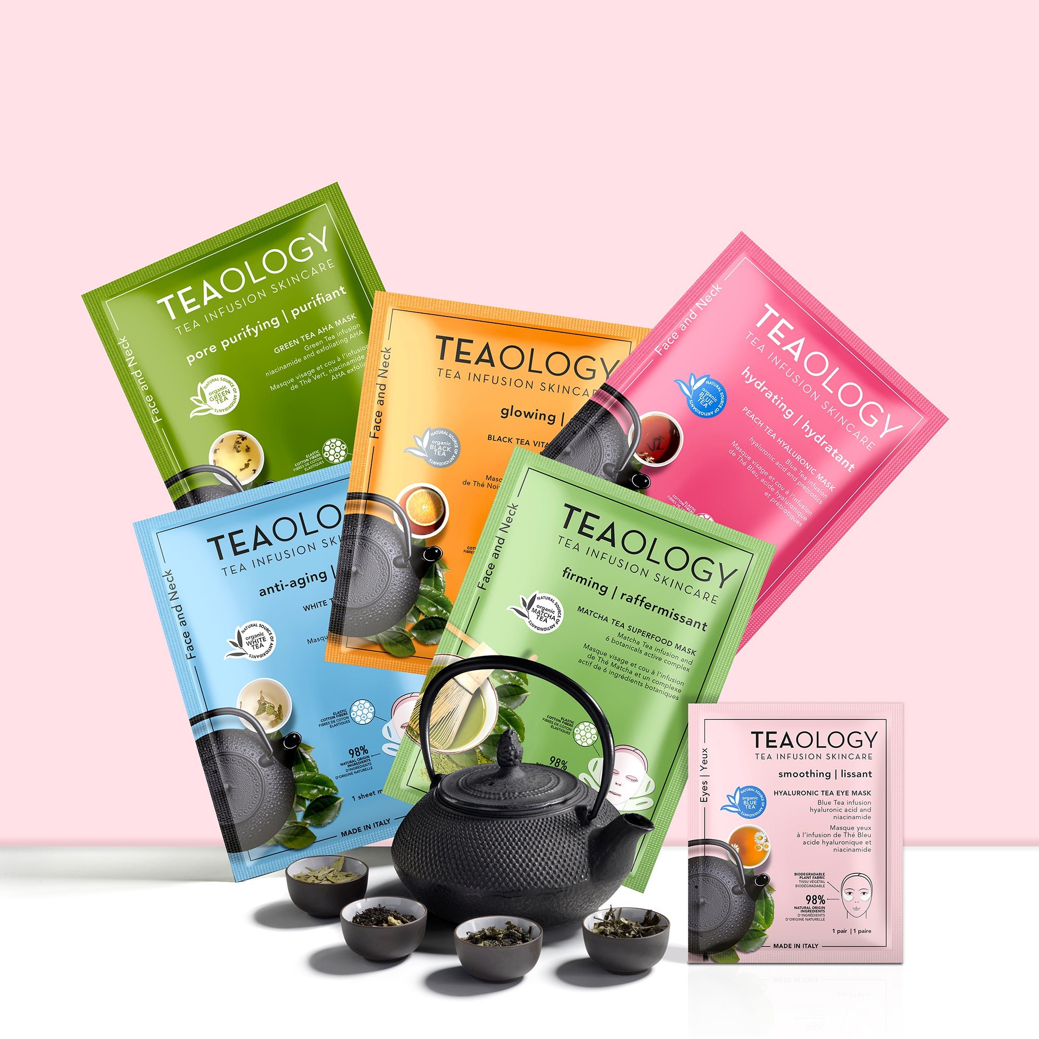 Die Teaology Green Tea AHA Mask ist ein Schönheitsaufguss für die Haut. Diese weiche Maske aus elastischen Baumwollfasern schmiegt sich perfekt an Gesicht und Hals an und entfaltet eine dreifache Wirkung. Sie verhindert das Verdunsten der Wirkstoffe, lässt sie in nur 10 Minuten einziehen und modelliert die Gesichtskonturen. Die Formel besteht aus einem Konzentrat unseres patentierten, auf Antioxidantien und Pollution getesteten Grüntee-Aufgusses, einem Peeling-Komplex aus Alpha-Hydroxysäuren (AHA) und einer natürlichen Salicylsäurequelle (BHA), die die Poren klärt und verfeinert, sowie Niacinamid (Vitamin B3), das Unreinheiten bekämpft und die Haut glatter macht, während Hyaluronsäure Feuchtigkeit spendet.