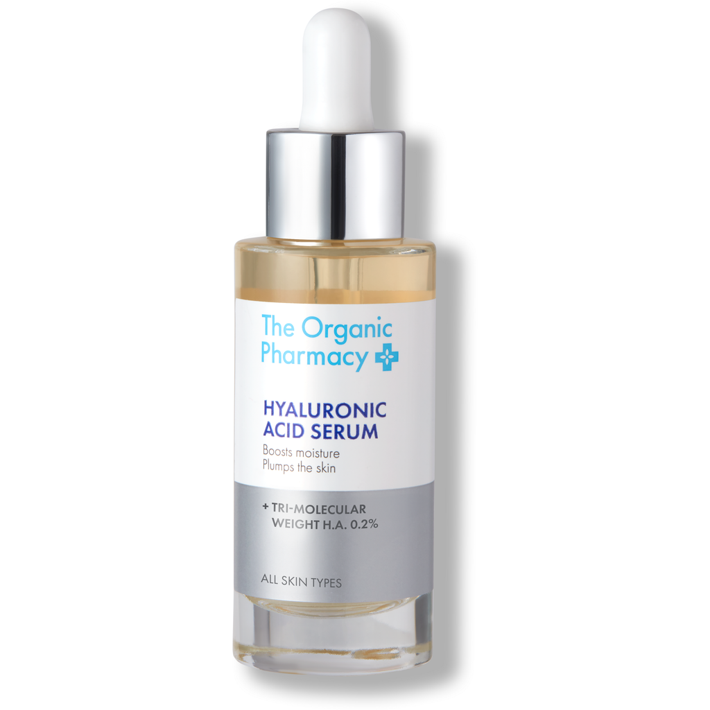 Das Hyaluronic Acid Serum 0,2% von The Organic Pharmacy enthält hochwirksame Hyaluron-Säure mit dreifach Molekulargewicht (nieder, mittel und groß). Es durchfeuchtet die Haut und polstert sie von innen heraus auf. Hyalron-Säure speichert ein Vielfaches seines Eigengewichts an Feuchtigkeit und sorgt so für eine pralleren, festen und glatteren Teint. Hyaluronic Acid Serum 0,2% kann jederzeit allein verwendet werden und lässt sich auch ausgezeichnet mit dem neuen Four Acid Peel 5%, Stabilised Vitamin C Serum oder Retinol Night Serum kombinieren. Alle Produkte von "The Organic Pharmacy" beinhalten ausschließlich biologische Inhaltsstoffe höchster Qualität und sind frei von allen synthetischen Schadstoffen, Fair Trade und ohne Tierversuche hergestellt.