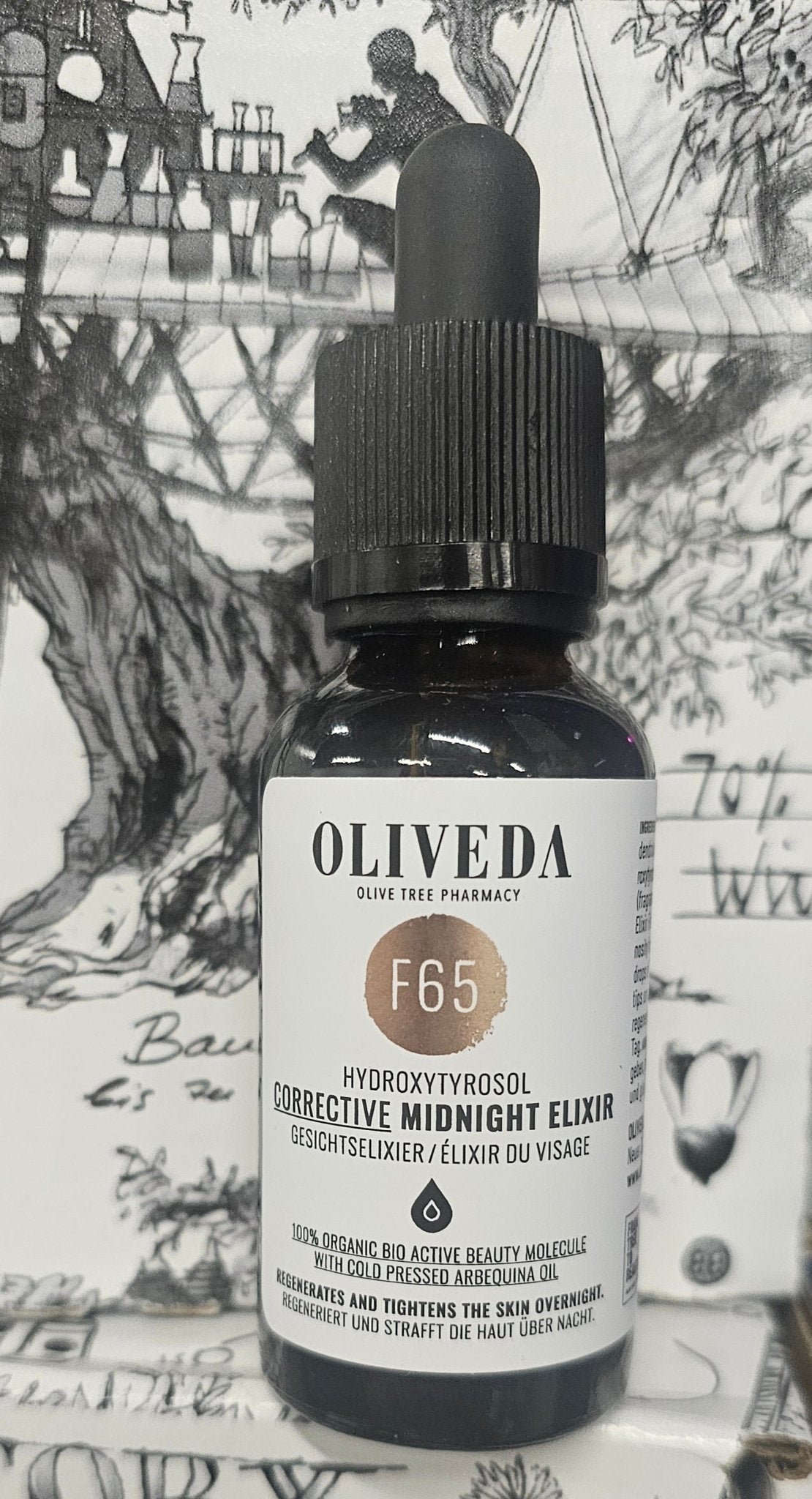 El aceite facial Midnight Elixir combina retinol, aceite de Arbequina y aceite de Kahai con el patentado "Complejo de Hialurón en Aceite" y el regenerador superantioxidante del olivo, el hidroxitirosol. El exclusivo complejo activo regenera y reafirma la piel durante la noche, las arrugas se suavizan y la luminosidad de la piel se intensifica mientras duermes. La delicada fragancia de bergamota y neroli relaja los sentidos y permite que encuentren la calma. La cálida lirio, tuberosa y ylang-ylang se fusionan con dulce caramelo, miel, cautivador cedro y almizcle en una mezcla emocionante y armoniosa. Agitar antes de usar. Colocar algunas gotas del Midnight Elixir en el dorso de la mano, recoger con las yemas de los dedos, aplicar en mejillas, frente, mentón y escote, y extender uniformemente. Mezclar 1-3 gotas del F65 Midnight Elixir con el suero F59 Face Hydroxytyrosol Corrective potencia el efecto regenerativo del F65.