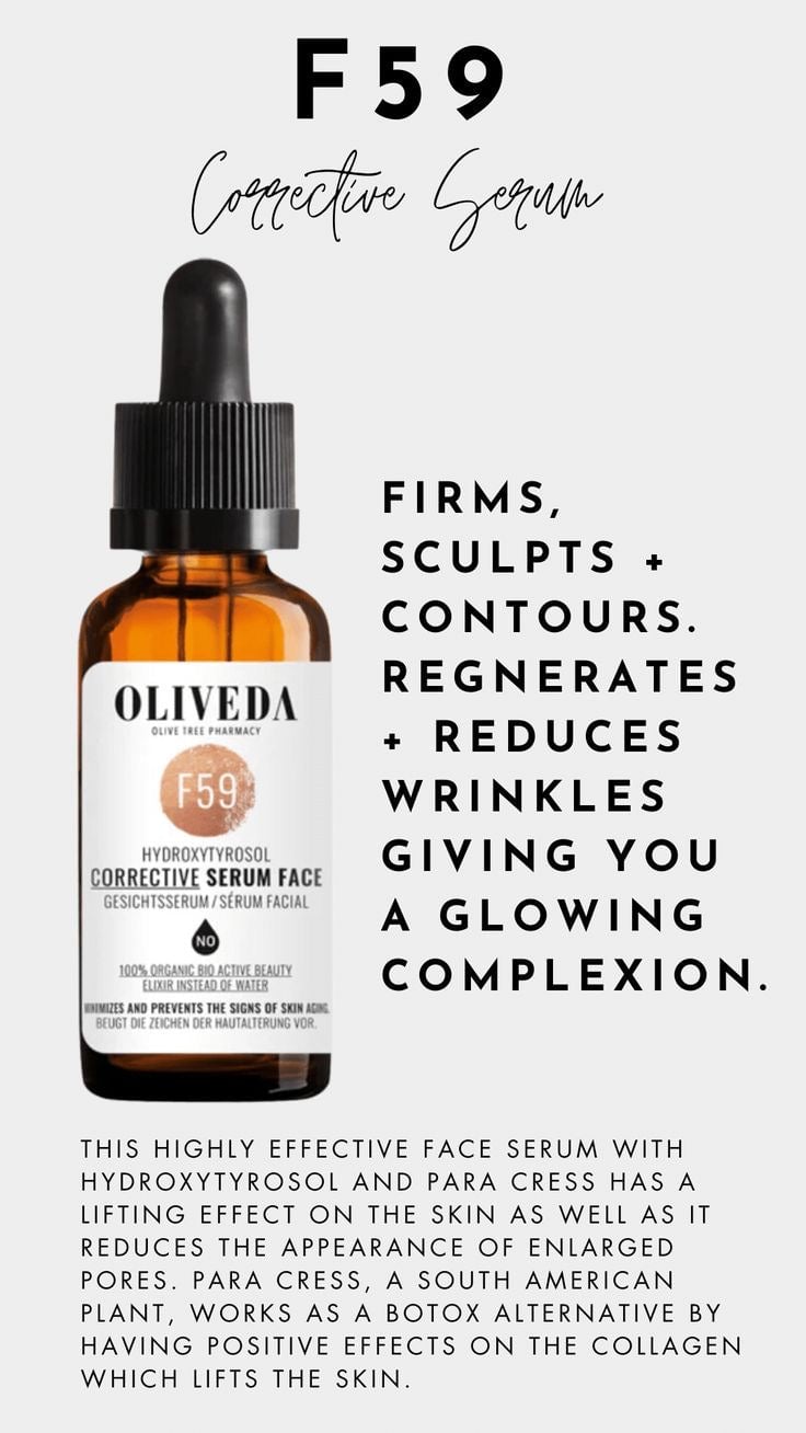Descubre el tan esperado Oliveda F59 Serum, lleno del milagroso hidratante Hydroxytyrosol, que le da a tu piel un brillo saludable y juvenil.