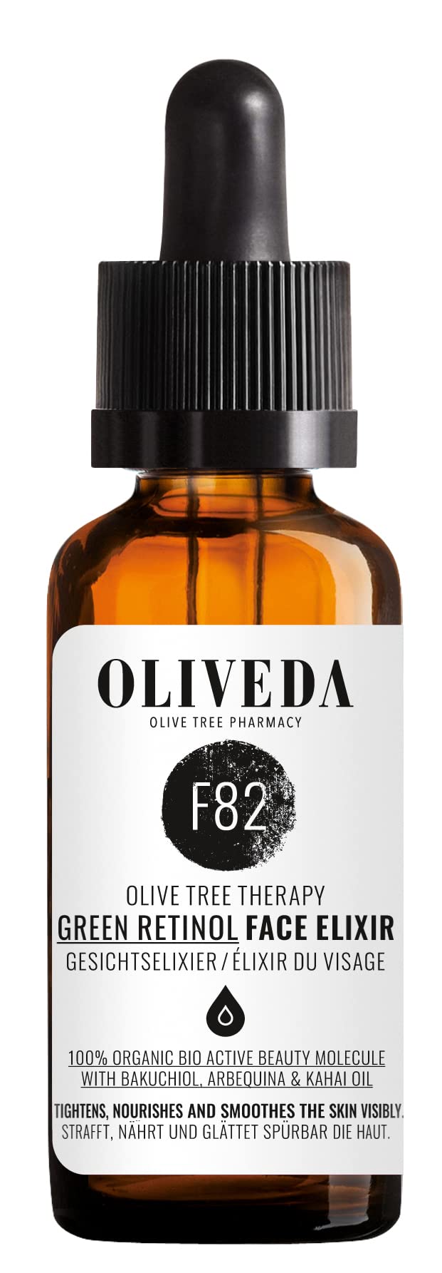El elixir facial F82 Green Retinol de OLIVEDA combina por primera vez el super antioxidante de belleza Hydroxytyrosol con el Green Retinol (Bakuchiol = retinol alternativo) y el aceite de Kahai rico en vitamina A para un cutis más claro y uniforme. El Bakuchiol corrige las líneas finas y reduce la apariencia de los poros, mientras que el Hydroxytyrosol junto con el aceite de Kahai minimiza las rojeces, combate las pigmentaciones y protege contra daños oxidativos. Además, el Bakuchiol estimula la producción de colágeno y actúa activamente contra el envejecimiento de la piel. El Bakuchiol (Green Retinol) es, al igual que el Hydroxytyrosol, una molécula de belleza vegana que se encuentra en las hojas y semillas de Psoralea Corylifolia, también conocida como Babchi, una planta india que se utiliza comúnmente en la medicina ayurvédica. Mientras que el Hydroxytyrosol se obtiene exclusivamente de los olivares de montaña propios y ecológicamente certificados de OLIVEDA, especialmente de las hojas del olivo, donde el antioxidante de belleza Hydroxytyrosol se encuentra hasta 3000 veces más concentrado que en el aceite de oliva y permite que las células de los árboles tengan hasta 4000 años de antigüedad.Por la mañana y por la noche, después de la limpieza, calienta 2-3 gotas en las palmas de las manos y masajea suavemente en el rostro, cuello y escote con movimientos circulares. Especialmente adecuado para pieles sensibles.